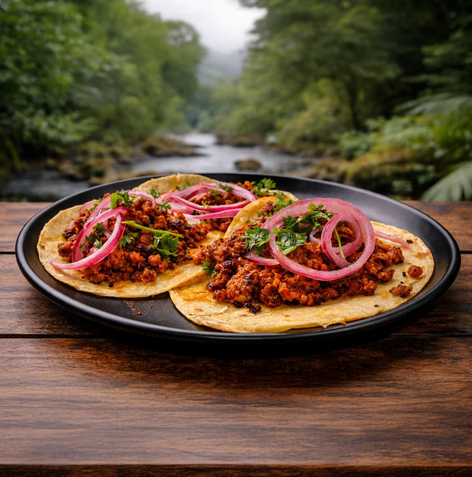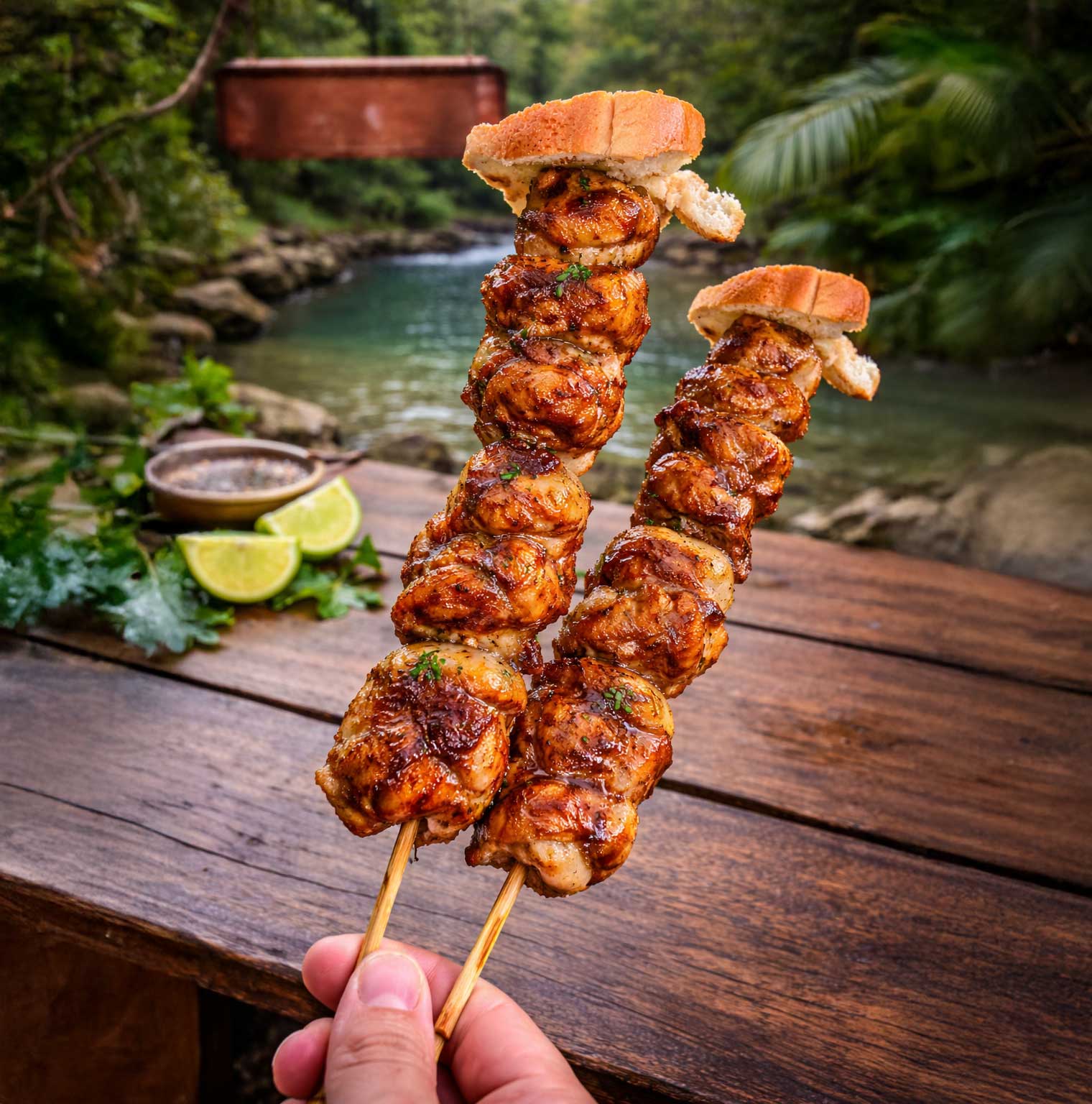 Fire-grilled chicken seasoned with criollo spices, served in a trio of warm tacos—juicy, flavorful, and perfect for enjoying one bite at a time by the river.