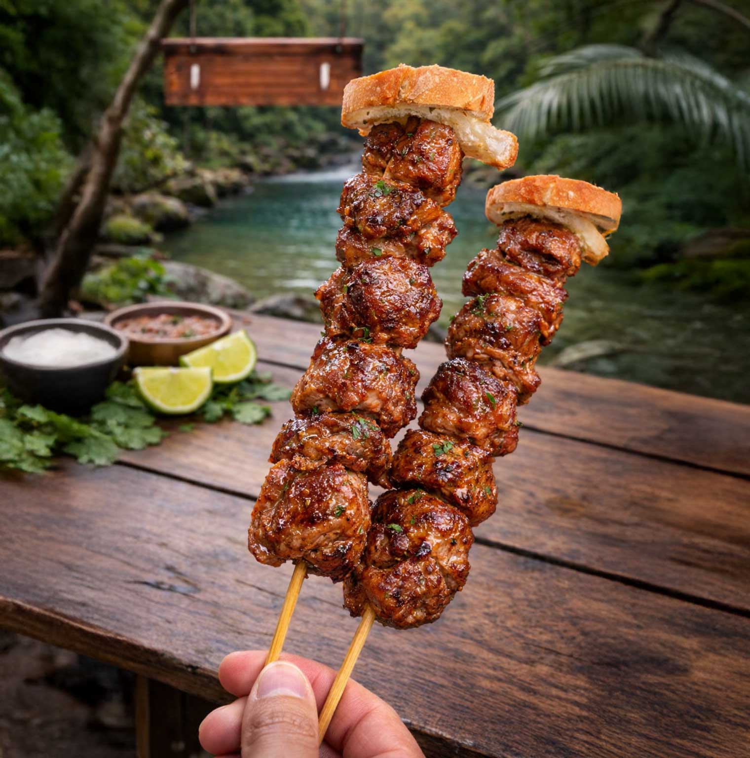 Juicy grilled beef patty served pincho-style, seasoned with bold criollo spices and finished over open fire for a smoky, satisfying bite with every mouthful.