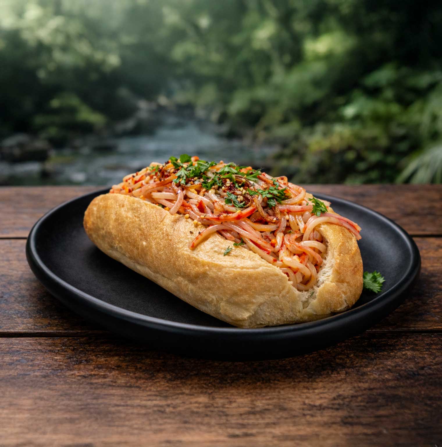 Spicy Crab Dog (Hotdog Style) — Soft bun loaded with tender spicy crab, tossed in a bold island-style sauce and finished with fresh herbs for a fiery bite with river vibes.